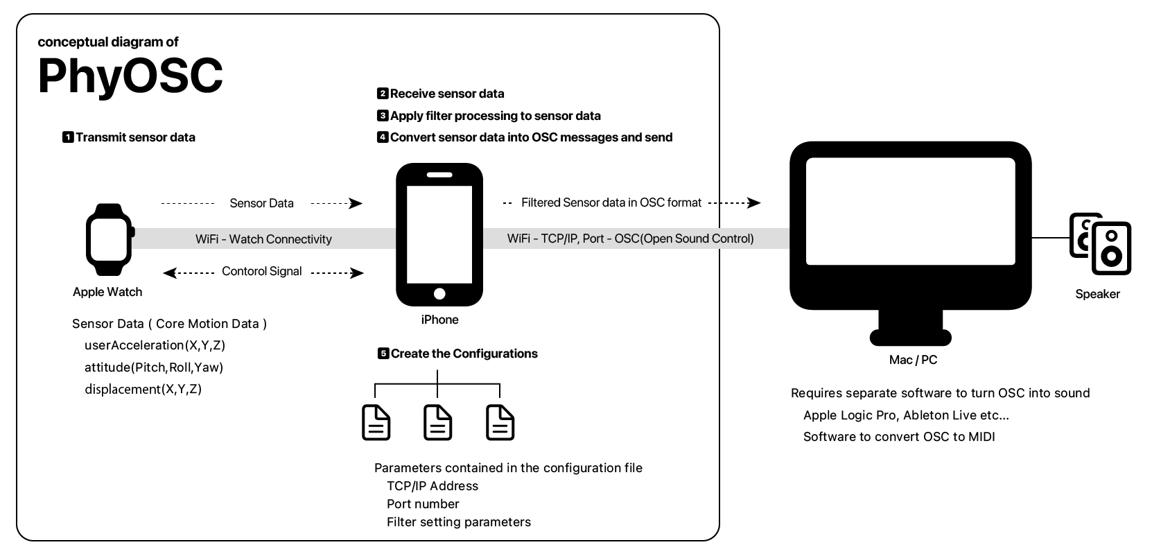 「コンフィグレーション」スクリーンで設定するOSC受信サーバーのIPアドレス/Portとデジタルフィルターは、コンフグレーションとして保存することができます。iOSデバイスはこのコンフィグレーションに従ってApple Watchから受信したセンサーデータをOSCメッセージに変換して送信します。